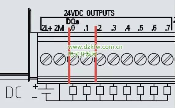 这个图是西门子ST20 PLC的接线图的DO部分,0.0-0.7这8个输出点都是晶体管输出的,如果上图这种接线方式的时候,