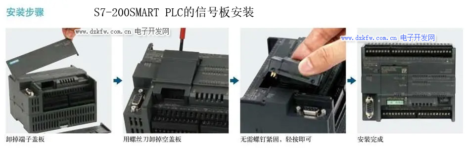 西门子PLC S7-200 SMART信号板在安装时,直接安装在西门子PLC S7-200 SMART的本体上面,因此无需占用额外空间。对于少量的I/O扩展和通讯端口的扩展需求,信号板为用户提供了便捷,经济的解决方案。信号板有如下几种类型: