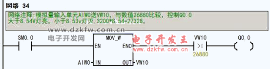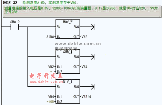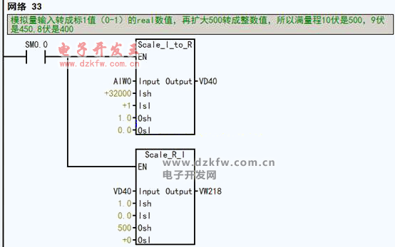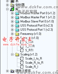 在这个指令库中,子程序Scale_I_to_R可用来进行模拟量输入到S7-200内部数据的转换;子程序Scale_R_I可用于内部数据到模拟量输出的转换。