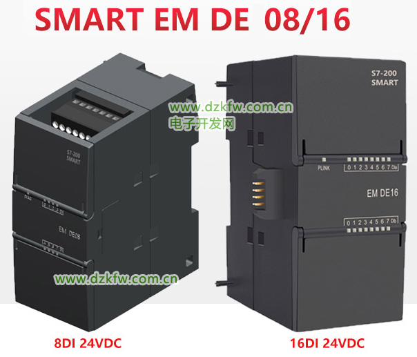 Smart系列PLC的数字量输入扩展模块包括:8通道数字量输入(EM DE08)和16通道数字量输入(EM DE16)两种。下面这张图是EM DE08和EM DE16的外观图: