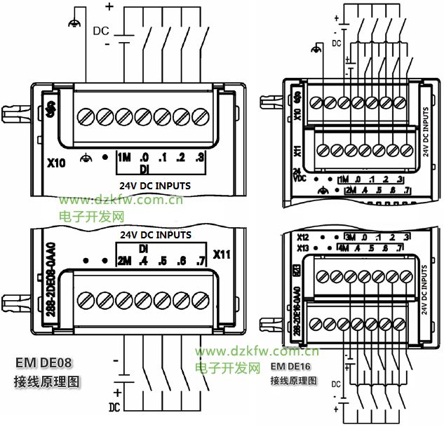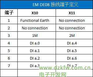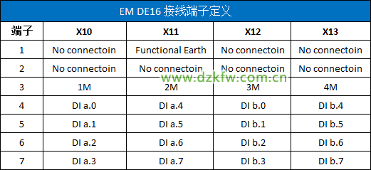 无论是8通道的数字量输入还是16通道的数字量输入模块,都支持源型和漏型两种输入方式;两种模块消耗背板5V电流相同,均为105mA,在选择电源模块时要注意电流的计算。EM DE08有两个接线端子:X10和X11,EM DE16有四个接线端子:X10、X11、X12和X13,各接线端子的定义如下表: