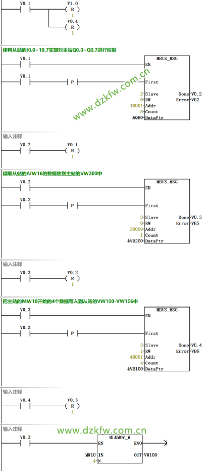 第一种状况:PLC作Modbus主网,Modbus详细地址和PLC指南里的详细地址一致,比如当家做主站的S7-200的MBUS_MSG命令用以向Modbus从站推送要求信息,和解决从站回到的回应信息。要载入从站(另一台S7-200)的I0.0逐渐的详细地址区的时候,它的键入主要参数Addr(Modbus详细地址)为10001。S7-200从站维持存储器的V区起止详细地址为VB200时,要载入从站VW200逐渐的V储存区的时候,维持存储器的详细地址是40001。