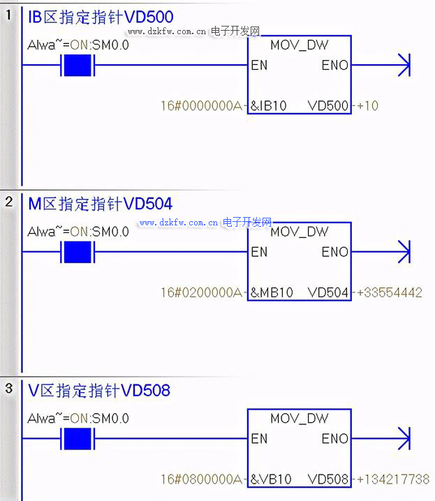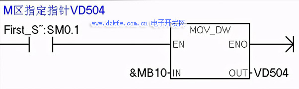 这样,就把MB10的实际地址以双字格式,存入了VD504,这时VD504内就代表了MB10的实际地址,同时VD504就代表了M区的地址指针。也就是说把VD504定义成了M区的一个地址指针.。