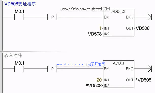 我们要注意:【VD504+10】,与【*VD504+10】含义是不一样,前者是地址加10,表示这时的指针地址指向了MB20,而后者是表示MB内的数据再加10.