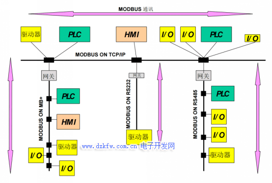 此协议支持传统的RS-232、RS-485、RS-422和以太网设备。许多工业设备,包括PLC,DCS,智能仪表,变频器等都在使用Modbus协议作为他们之间的通讯标准。有了它,不同厂商生产的控制设备可以连成工业网络,进行集中监控。