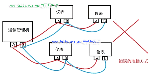 RS485总线要采用上图手拉手式的总线结构,坚决杜绝星型连接和分叉连接,如下图: