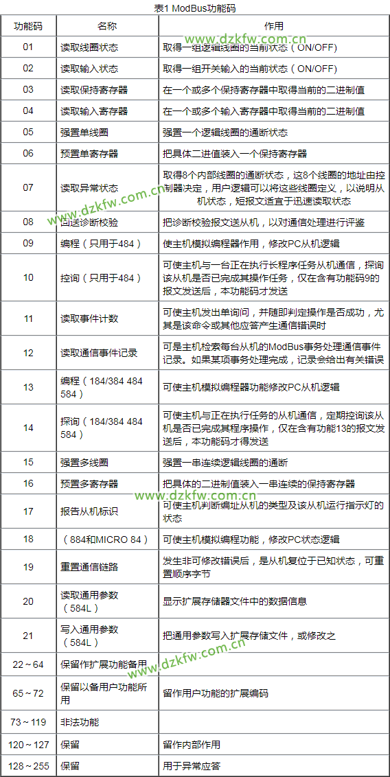 Modbus网络是一个工业通信系统,由带智能终端的可编程序控制器和计算机通过公用线路或局部专用线路连接而成。其系统结构既包括硬件、亦包括软件。它可应用于各种数据采集和过程监控。下表1是ModBus的功能码定义。