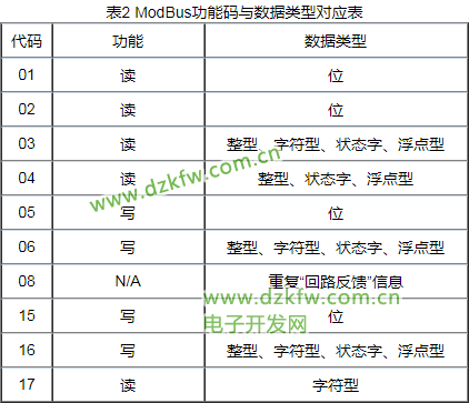 Modbus网络只是一个主机,所有通信都由他发出。网络可支持247个之多的远程从属控制器,但实际所支持的从机数要由所用通信设备决定。采用这个系 统,各PC可以和中心主机交换信息而不影响各PC执行本身的控制任务。表2是ModBus各功能码对应的数据类型。
