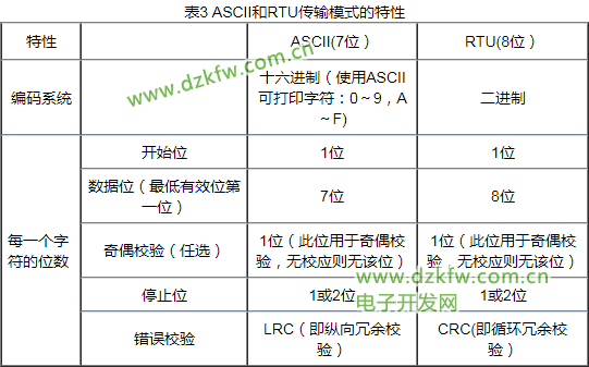 在ModBus系统中有2种传输模式可选择。这2种传输模式与从机PC通信的能力是同等的。选择时应视所用ModBus主机而定, 每个ModBus系统只能使用一种模式,不允许2种模式混用。一种模式是ASCII(美国信息交换码),另一种模式是RTU(远程终端设备)这两种模式的 定义见表3