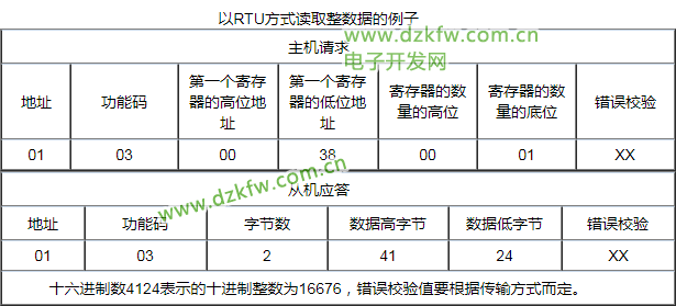 用RTU模式传输的数据是8位二进制字符。如欲转换为ASCII模式,则每个RTU字符首先应分为高位和低位两部分,这两部分各含4位,然后转换成十六进 制等量值。用以构成报文的ASCII字符都是十六进制字符。ASCII模式使用的字符虽是RTU模式的两倍,但ASCII数据的译玛和处理更为容易一些, 此外,用RTU模式时报文字符必须以连续数据流的形式传送,用ASCII模式,字符之间可产生长达1s的间隔,以适应速度较快的机器。表4给出了以RTU 方式读取整数据的例子