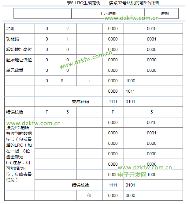 表5 LRC生成范例--读取02号从机的前8个线圈