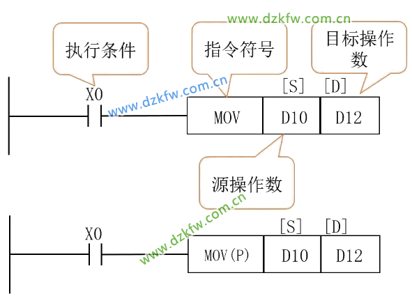 功能指令一般由执行条件、指令符号和操作数三部分组成。可以选择连续执行和脉冲执行,选择脉冲执行时需要在指令符号后加(P),表示检测到执行条件(X0)的上升沿时执行一次;连续执行则表示当X0为ON状态时一直执行。