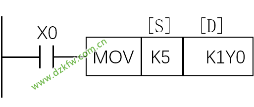 该指令的功能是将源操作数传送到指定的目标操作数。当执行条件为ON时,该指令执行;当执行条件为OFF时,该指令不执行,数据保持不变。下图表示将常数5传入到位元件组K1Y0中,在传入时常数5会自动转换为二进制数。