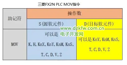 注释:K表示十进制常数;H表示十六进制常数;KnX… KnS以K1Y000进行说明:K1Y000表示以Y0为开始的连续4*1个位,即Y0,Y1,Y2,Y3; T表示定时器;C表示计数器;D表示数据寄存器;V/Z表示变址寄存器。