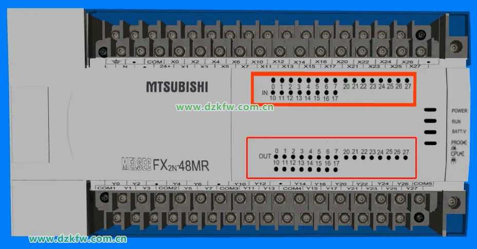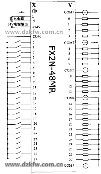 FX2N-48MR-001单元共有24个数字量输入端子和24个数字量输出端子。其中24个输入端子为一组,共用公共端COM。 N, L两个端子提供DC 24V/400mA传感器电源,可以作为传感器的电源输出,也可以作为输入端的检测电源使用。24个数字量输出端子分成五组: