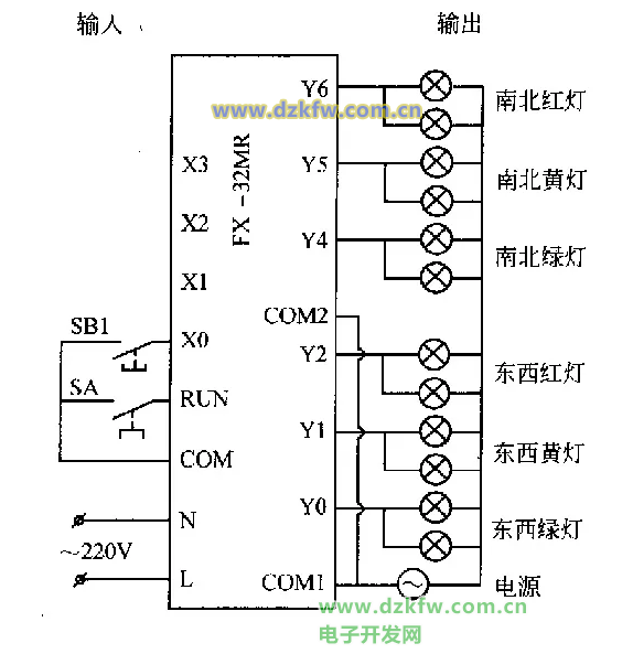 分组式输出是几个输出点为一组,共用一个公共端,各组之间是分隔的,可分别使用不同的电源。