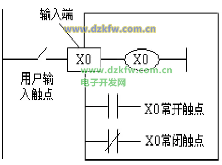 输入接口的一个接线点对应一个输入继电器。其线圈吸合释放只取决于外部触点的状态,而不能用程序驱动。当外部有输入时,对应触点动作。