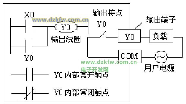 输出接口的一个接线点对应一个输出继电器,输出继电器的线圈只能由程序驱动,而无法由外部信号驱动。每个输出继电器为内部控制电路提供编程用的常开、常闭触点。