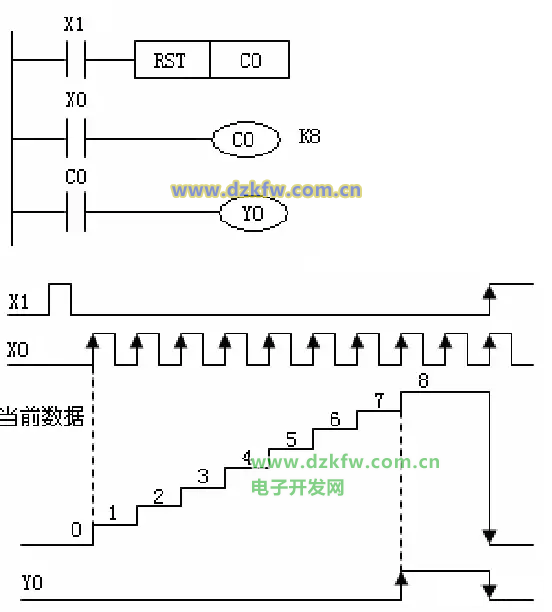 用于对内部映像寄存器(如X、Y、M、S、T等)提供的触头信号上升沿进行计数,计数到指定值后,对应触点动作。