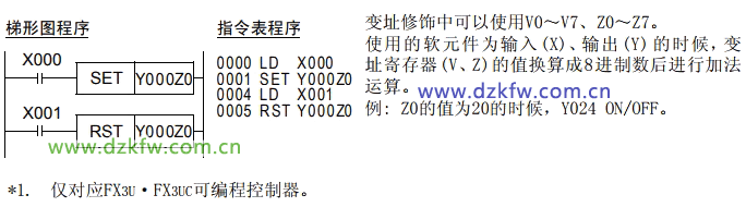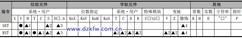 SET指令和RST指令中使用的软元件,可以采用变址寄存器(V、Z)进行修饰。 (状态(S)、特殊辅助继电器(M)、32位计数器(C)、D□.b、字软元件不能修饰。)