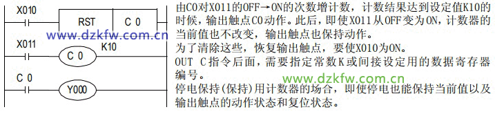 3) 字软元件的当前值清除(RST指令[当前值及寄存器的清除]) RST指令是清除(T)、计数器(C)、数据寄存器(D)、扩展寄存器(R)和变址寄存器(V)、(Z)的当前值数据的 指令。 此外,要将数据寄存器(D)和变址寄存器(V)、(Z)的内容清零时,也可使用RST指令。(使用常数为K0的MOV 传送指令也可以得到相同效果。) 另外,使用RST指令也可以对累计定时器T246~T255的当前值和触点复位。 可以对于同一软元件,多次使用SET、RST指令,而且顺序也可随意。