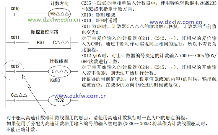 用于跳转程序/子程序/中断程序时的注意事项 在跳转程序、子程序以及中断程序中对定时器、计数器执行RST指令时,定时器和计数器保持被复位的状 态,并且定时器和计数器有可能出现不工作的情况。