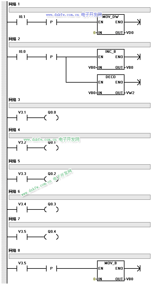 功能描述: 在梯形图中,译码指令以功能框的形式编程,当允许输入EN有效时,将字节型输入数据IN的低4位的内容译成位号(00~15),且将由OUT指定字的该位置1,其余位置0。