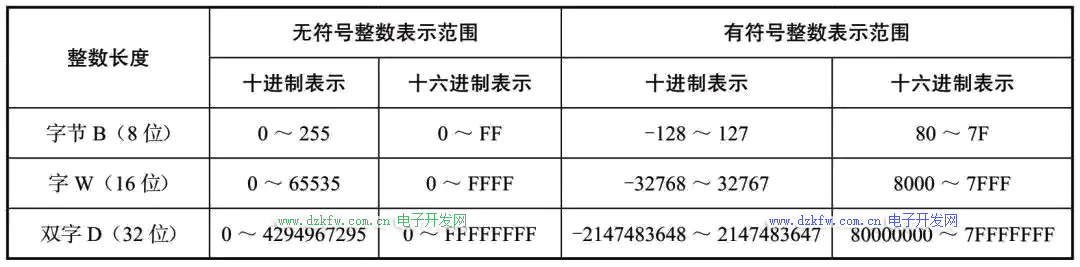 整数型数据不带小数点,它分为无符号整数和有符号整数,有符号整数需要占用1个最高位表示数据的正负,通常规定最高位为0表示数据为正数,为1表示数据为负数。表1列出了不同字长的整数表示的数值范围。