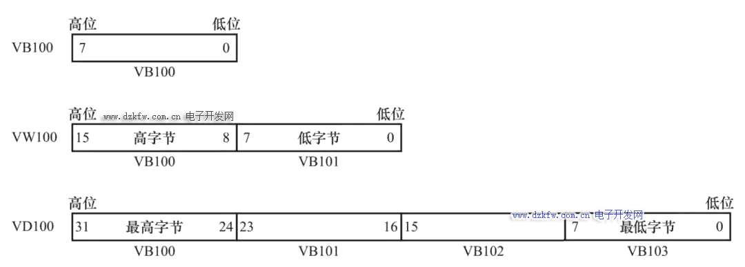 例如,寻址时给出VB100,要查找的地址为V存储区的第100字节;若给出VW100,则要查找的地址为V存储区的第100、101两个字节;若给出VD100,则要查找的地址为V存储区的第100~103四个字节。VB100、VW100、VD100之间的关系如图2所示,VW100即为VB100和VB101,VD100即为VB100~VB103。当VW100单元存储16位二进制数时,VB100存高字节(高8位),VB101存低字节(低8位);当VD100单元存储32位二进制数时,VB100存最高字节,VB103存最低字节。