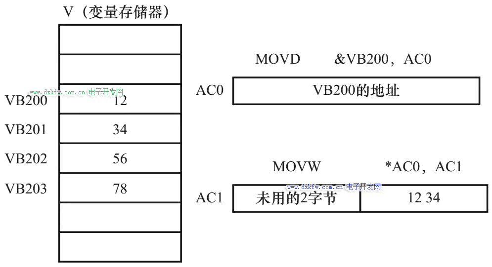 MOVW *AC0, AC1 //以AC0中的地址(VB200的地址)作为首地址,将连续两个字节(一个字,即VB200、VB201)单元中的数据存入AC1中