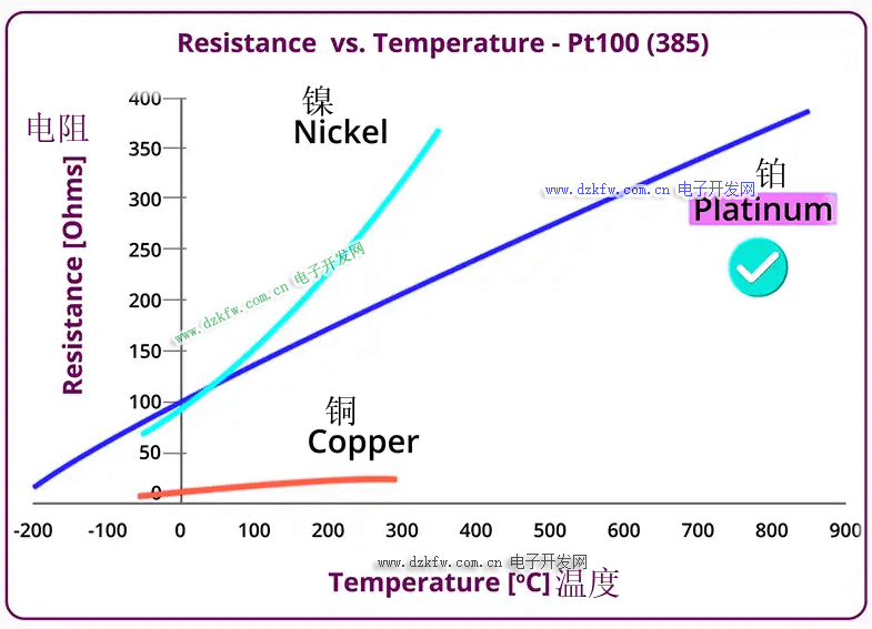 虽然 RTD 可以由多种金属制成,包括镍和铜,但铂的物理特性使其非常适合用于 RTD温度传感器。