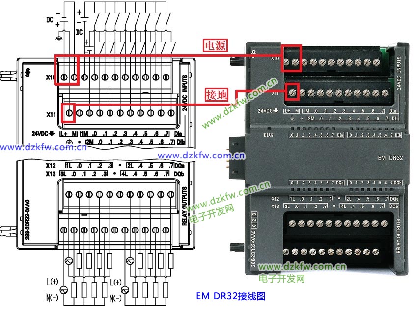 (1) 模块缺少24V直流供电电源; I/O扩展模块缺少24V直流供电电源时,所有通道指示灯也以红色闪烁。建议核对模块接线图,尤其是模块供电端含两排端子的,确定供电接线是否正确,以EM DR32为例,正确的接线方式如下图所示。