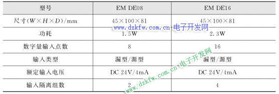 西门子 S7-200SMARTPLC 的数字量输入扩展模块包括两种类型: 8 点 24V 直流电源输入、 16 点 24V 直流电源输入。输入方式分为直流 24V 源型、漏型输入。这两种数字量输入扩展模块类型的型号分别为 EMDE08 和 EMDE16 ,其主要技术参数如表所示。