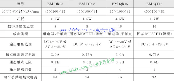 西门子 S7-200 SMART PLC 的数字量输出扩展模块包括 2 种类型: 8 / 16 点 DC 24V 晶体管输出、 8 / 16 点继电器输出。输出方式分为直流 24V 源型输出以及交流 120 /230V 的继电器输出。这 2 种数字量输出扩展模块类型的型号分别为 EMDR08、EMDT08、EMQR16和 EMQT16 ,其主要技术参数如表所示。