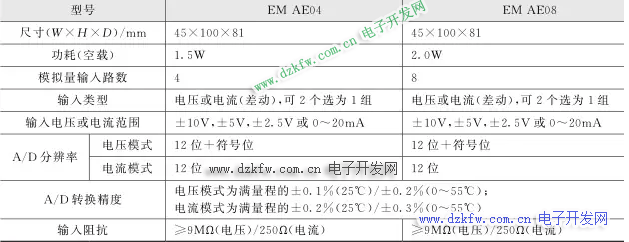 西门子 S7-200SMARTPLC 的模拟量输入扩展模块有 2 种型号: EMAE04 和 EMAE08 。其中, EMAE04 为 4 路模拟量输入, EMAE08 为 8 路模拟量输入,它们的主要技术参数如表所示。