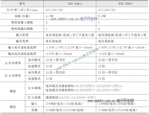 西门子 S7-200 SMARTPLC 的模拟量输入/输出扩展模块同样有 2 种型号: EMAM03和 EMAM06 。其中, EMAM03 为 2 路模拟量输入/ 1 路模拟量输出, EMAM06 为 4 路模拟量输入/ 2 路模拟量输出,它们的主要技术参数如表所示。