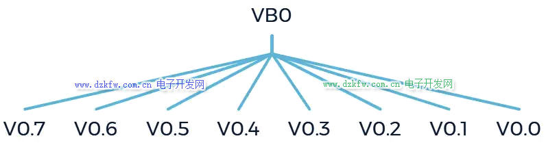 VB0:表示V存储区的字节0,包含了V0.0—V0.7,8个二进制位。V0.0是低位,V0.7是高位。