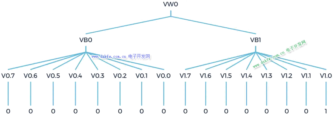 VW0:表示V存储区的字0,包含VB0、VB1,VB0包含V0.0—V0.7。VB1包含V1.0—V1.7。VW0中V0.7是最高bit位,V1.0是最低bit位,VB0是高字节,VB1是低字节。