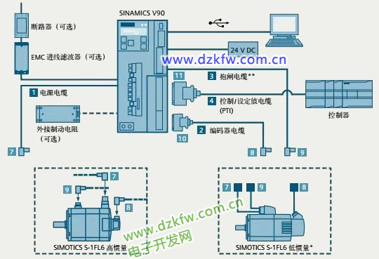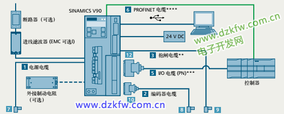 SINAMICS V90 PROFINET 版本的系统接线图: