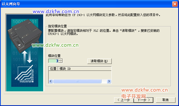 3.出现模块位置选项,可以连接到实际的PLC系统中在线读取模块的位置,也可以计算模块的位置,从CPU开始,其后的第一个模块为0,以此类推,可以推算出CP243-1的模块位置。