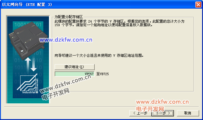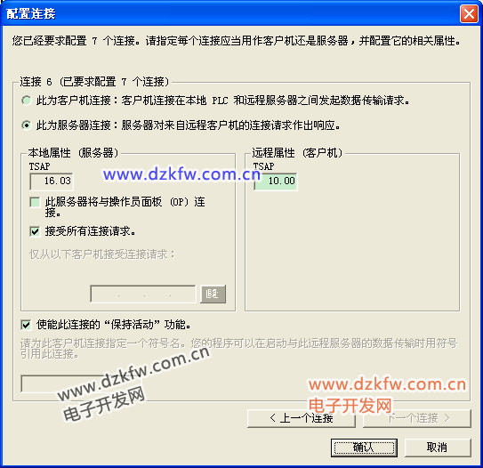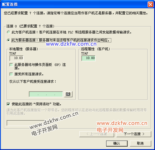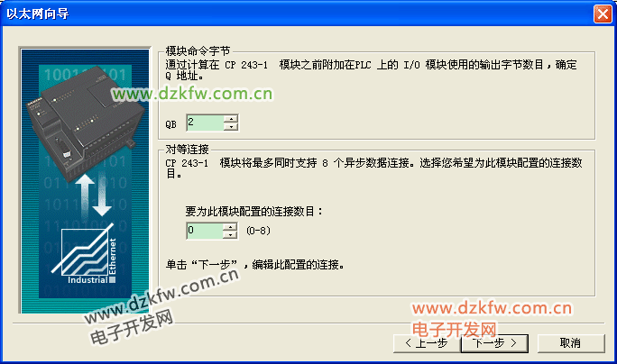 如果向导在步骤3读取模块位置,输出内存地址会自动显示。 这个QB的地址指CP243-1模块前用到的最大的Q地址+1。 配置连接数目,这里最多只能配置8个连接