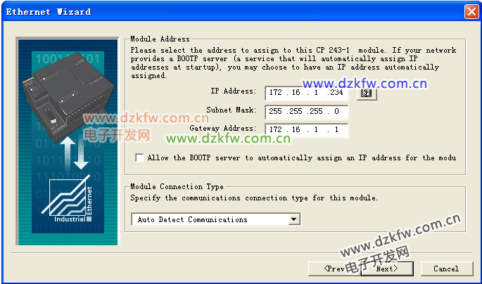2)点选[Next]到IP地址配置界面,输入分配给PLC1的IP地址,如图2所示。