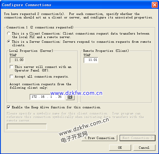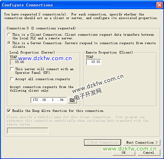 首先选择[Server Connection]选项,将200设置为Server,[Remote Properties]中TSAP填写10.01,页面左侧[Local Properties]编辑框中10.00是自动生成的,不能配置,[Accept connection] IP地址填写欲连接该200的上位机PC1的IP地址,如图4所示。