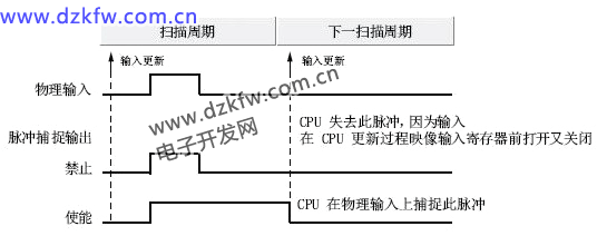 脉冲捕捉功能,主要是对一些信号变化比较快的信号的上升沿或是下降沿进行捕捉,使其其锁存为1得到下一个扫描周期扫描到为止,如图所示