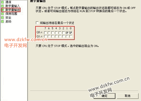 将输出冻结在最后状态: 单击此复选框,就可在进行RUN 到STOP 转换时将所有数字量输出冻结在其最后的状态。