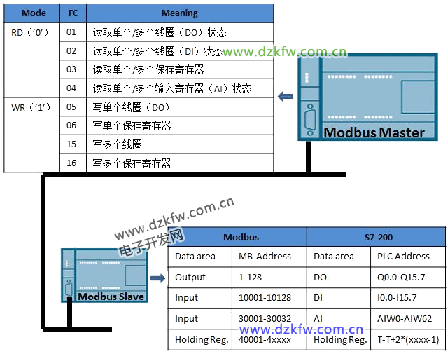 上图是一个典型的主站和从站的网络结构,对于Modbus主站而言可以对从站进行读或者写的操作,其中它所支持的功能码(FC,Function Code)包括主站左侧表格中所述功能,例如功能码为'01'时表示读取单个/多个线圈(DO)状态或功能码为'04'时表示读取单个/多个输入寄存器(AI)状态。而对于从站,我们只需要把Modbus的标准地址和从站的地址对应关系建立好就可以了,S7-200的从站与Modbus标准的对应关系如从站右侧表格所示。表中左侧是Modbus标准地址码,其中1-128对应于S7-200的Q0.0-Q15.7,10001-10128对应于S7-200的I0.0-I15.7,30001-30032对应于AIW0-AIW62,40001-4xxx对应的是S7-200的保持寄存器(V区),它的范围是T-T+2*(xxxx-1),T表示的是V区的起始地址,这一点由Modbus从站的指令所决定的。