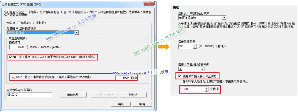 2、S7-200包络定义为“单速连续旋转”且使用PTOx_ADV指令后继续发送指定脉冲停止功能,在S7-200SMART 可以使用RPS输入点停止,可以通过DO点控制RPS输入点实现,如图8所示: