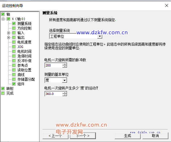测量单位设定为度。(若搭配安装丝杆后,可以根据导程,设定测量单位为mm,那么一次旋转产生的距离为一个导程,脉冲数量不变)