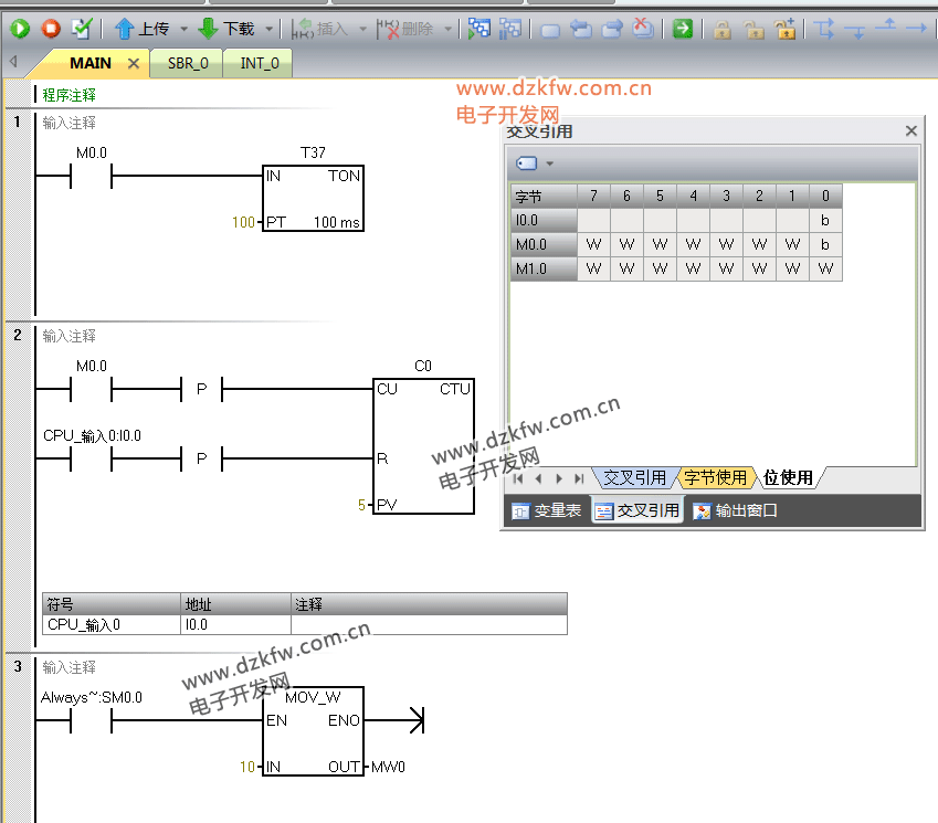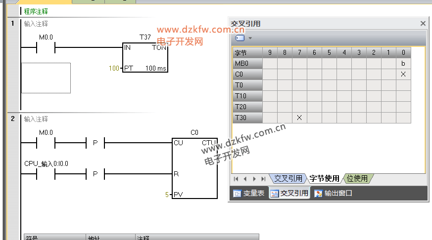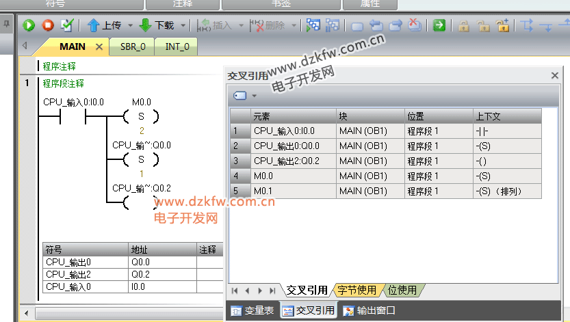 如上图中,交叉引用中显示了,程序中使用了I0.0,并且I0.0位于主程序块程序段1中,而且使用的是常开点;