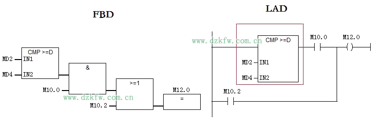 LAD是最常用的plc编程语言,其形象、直观,稍懂电气的人就能很快上手,而且目前市面上几乎所有的PLC都支持LAD编程,一通百通。其在“继电器或接触器型”逻辑功能中应用比较好,但随着STEP7中集成的程序功能单元越来越多,LAD语言写出的程序多少有点“不伦不类”。如图6所示,程序单元“CMP>=D”在FBD程序中,以“块”的形式显示,与其他单元一样;但在LAD语言中,仍以“块”的形式显示,与其它“触点单元”放在一起显得有点格格不入,虽然不影响逻辑,但看起来不工整。
